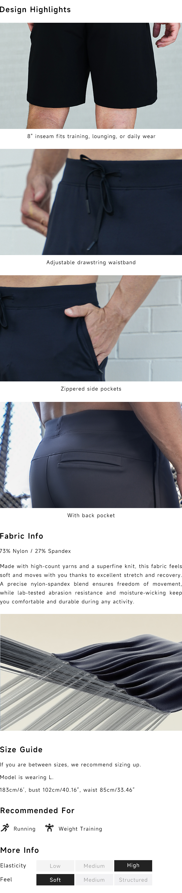 Whether you're hitting the gym or relaxing on the weekend, the 8" inseam shorts move with you. The adjustable drawstring waistband provides a comfortable, customized fit, while zippered side pockets and a back pocket keep your essentials safe and within reach throughout the day.