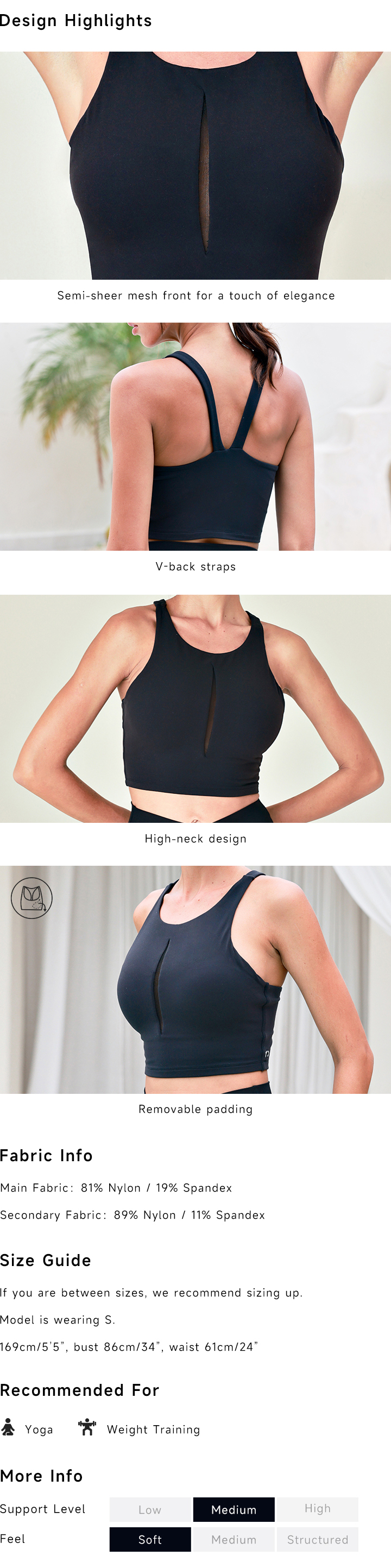 Effortlessly transition from studio to street with the Cunning Sports Tank. Featuring a hint of sheer mesh for elegance and adjustable V-back straps for ease, this high-neck design offers medium support and all-day comfort. Perfect for yoga, gym workouts, or casual layering.