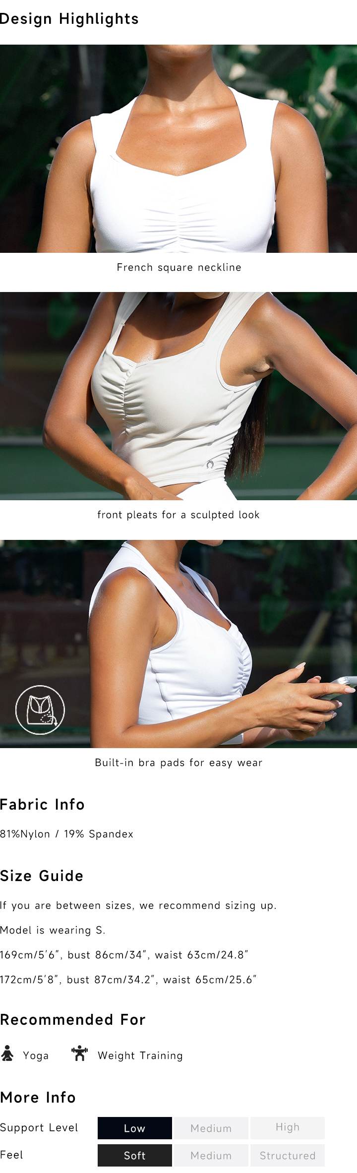 Move with elegance—whether at the gym or out for a casual day. The French square neckline and sculpted pleats create a flattering silhouette, while the open-back design keeps you cool. With built-in bra pads, you can wear it solo for effortless style and comfort.
