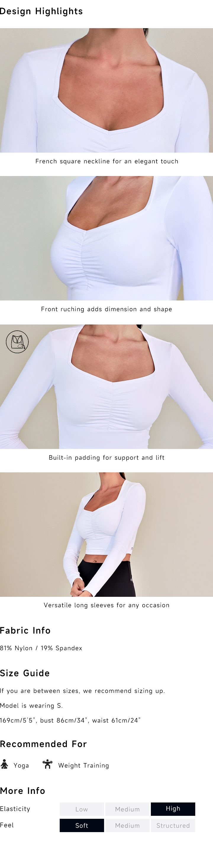This long-sleeve top combines elegance with versatility, featuring a French square neckline that highlights the collarbones and a slim-fit design to enhance your curves. Built-in graduated padding offers support and lift, making it perfect for solo wear. Ideal for both workouts and everyday style.