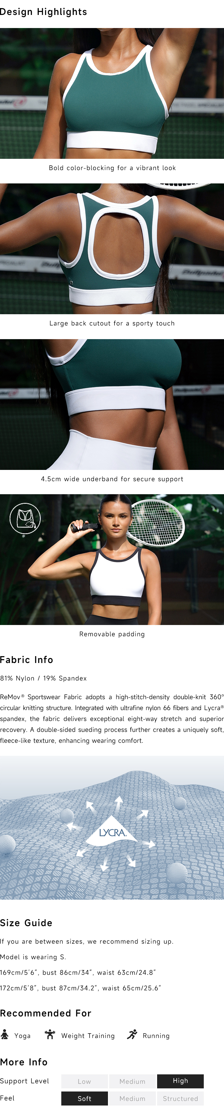 Power up your workouts with bold energy. The dynamic color-block design makes a statement, while the wide underband ensures all-day support. A daring circular back cutout adds breathability and style, and the removable push-up pads enhance your natural shape. Move freely, feel confident, and own every rep.