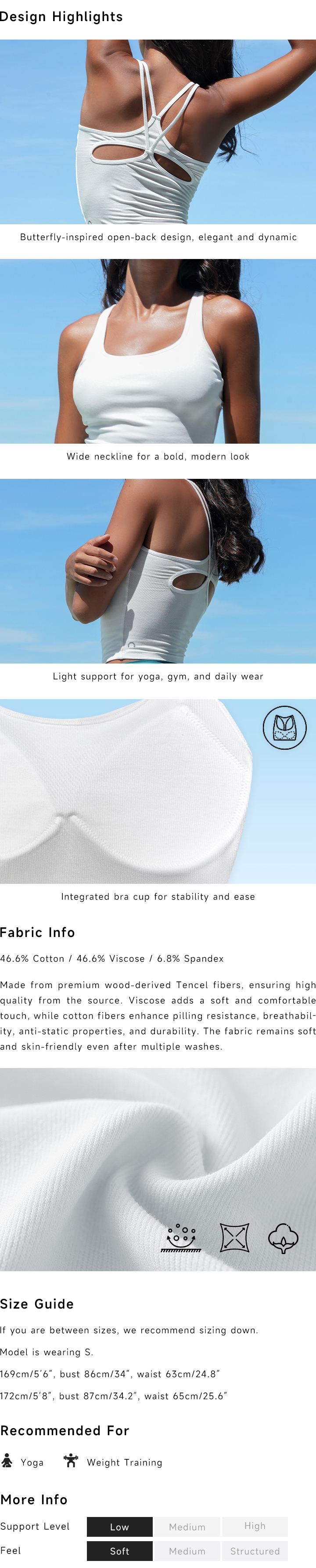 Designed to move with grace, this longline tank features a statement open-back cut that brings both energy and elegance. The wide neckline adds a modern edge, while the built-in cup stays comfortably in place. Perfect for yoga, studio workouts, or simply styled solo on the go.