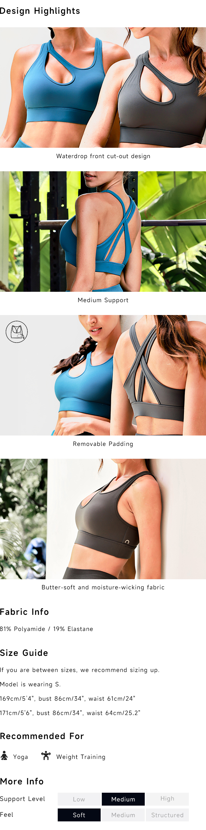The Heartbeat Sports Bra is a medium-support top. The water-drop front cut-out is the star of the show here, creating a look that is both sexy and sporty. The butter-soft, moisture-wicking fabric allows you the utmost comfort & freedom during your workout. Removable padding is included for use according to your personal preference.