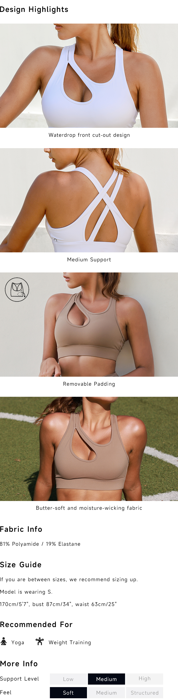 The Heartbeat Sports Bra is a medium-support top. The water-drop front cut-out is the star of the show here, creating a look that is both sexy and sporty. The butter-soft, moisture-wicking fabric allows you the utmost comfort & freedom during your workout. Removable padding is included for use according to your personal preference.
