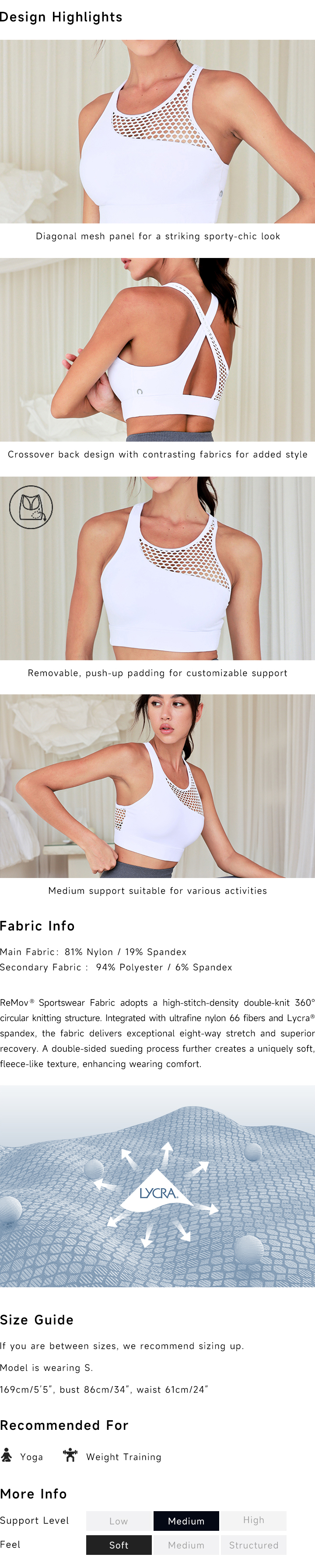 This stylish sports bra combines fashion and function with a unique diagonal mesh panel and a crossover back. Made from Lycra spandex, it offers a soft, skin-friendly feel with medium support. Removable padding adds shape and flexibility, making it ideal for yoga or gym training.
