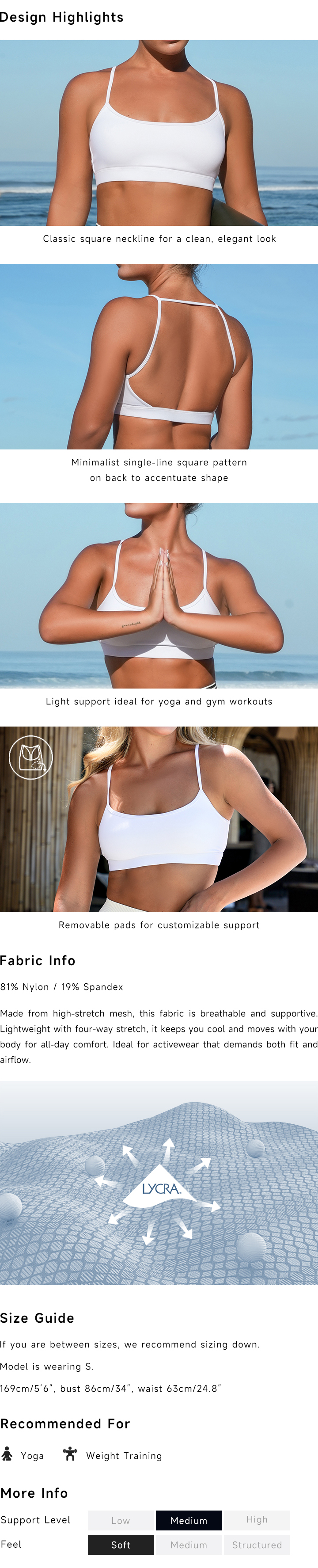Effortlessly stylish, this top features a timeless square neckline and subtle back detailing that enhances your silhouette. With removable pads and light support, it’s perfect for smooth, comfortable movement during yoga or gym sessions.