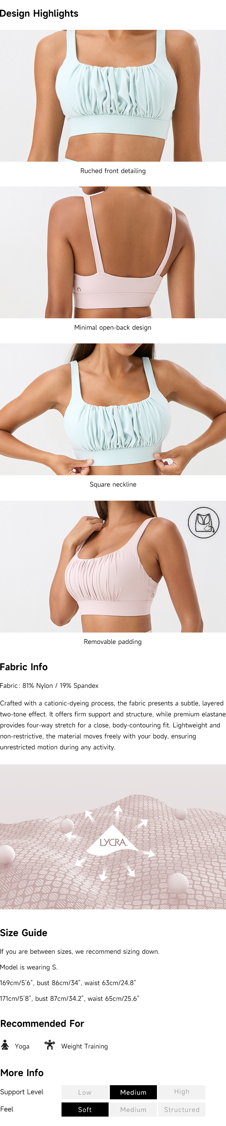 The Pleats Sports Bra centers on texture and light. A delicately gathered front adds soft dimension, balanced by a minimalist open back that lets your skin breathe. Designed for a weightless yet secure feel, it contours to your rhythm with a sculpted fit that never holds you back. Thoughtful detailing for total fluidity.