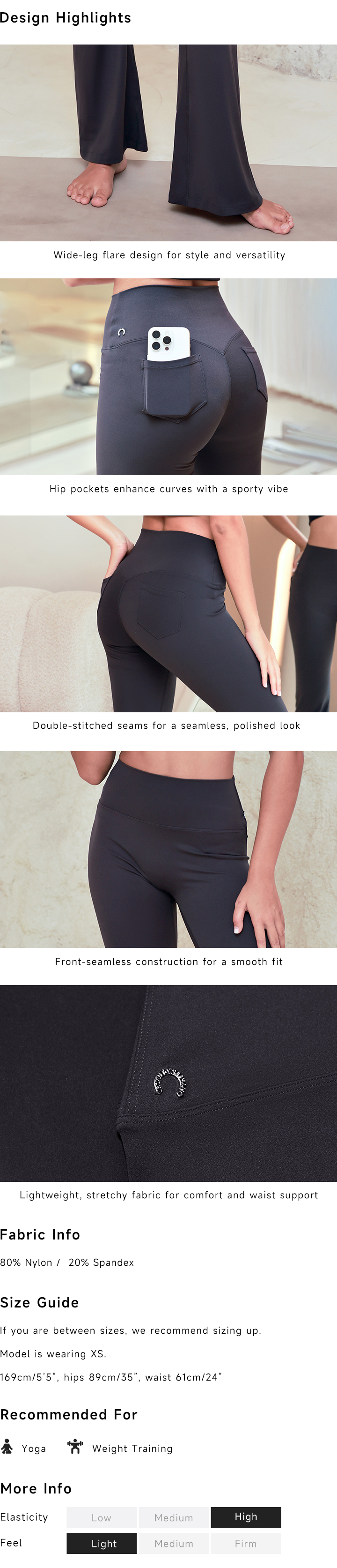 These versatile flare pants combine elegance and functionality with a flattering wide-leg design and seamless comfort. The hip pockets add a sporty touch, while the lightweight, draped fabric ensures a sleek and comfortable fit for both everyday wear and workouts.