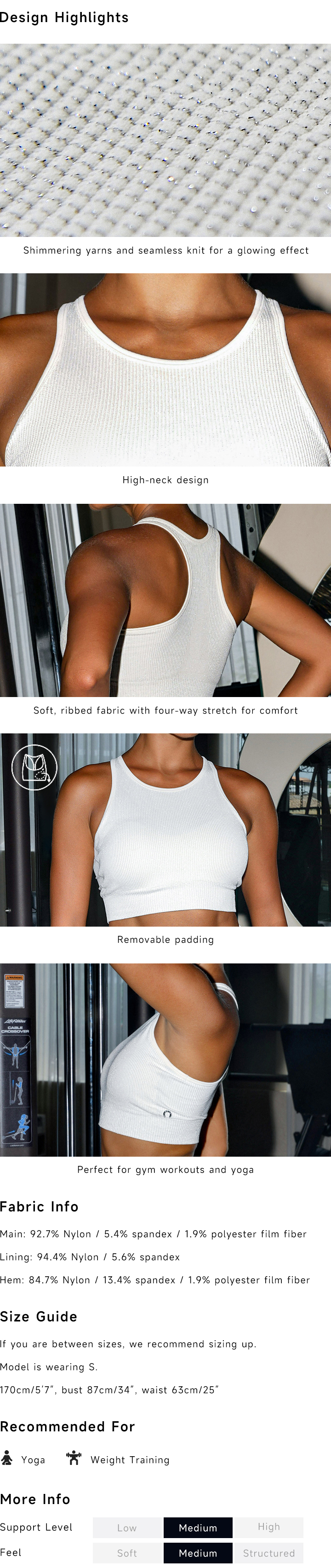 Designed for effortless style and support, this bra features shimmering yarns and seamless knit for a glowing finish. Its high-neck design and removable padded cups provide a clean look and flexible comfort—perfect for yoga or gym sessions where movement and comfort are key.