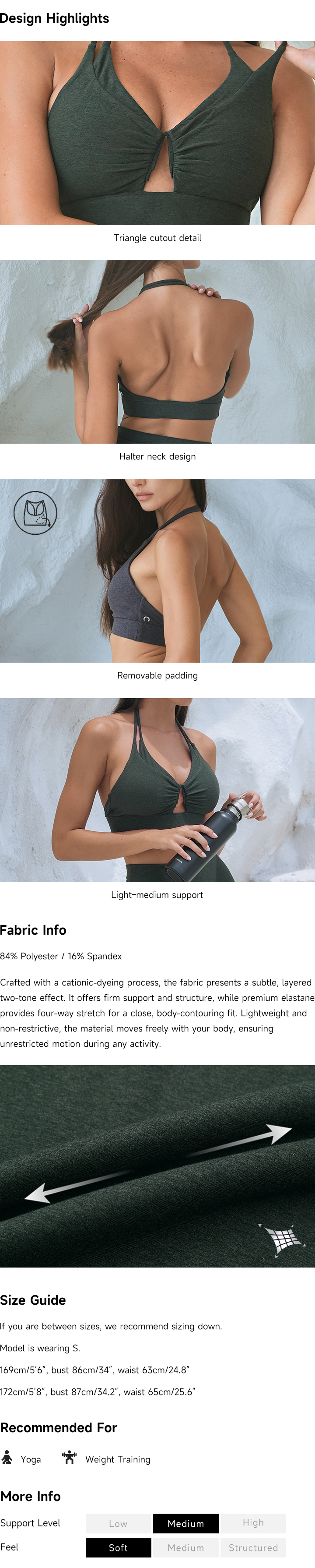 The Triangle Hollow Sports Bra brings a bold yet balanced look to active wear, blending clean lines with subtle openness. Light support and a secure feel make it easy to wear for yoga-inspired movement, low-impact training, or styled as part of an athleisure outfit when comfort and design matter equally.