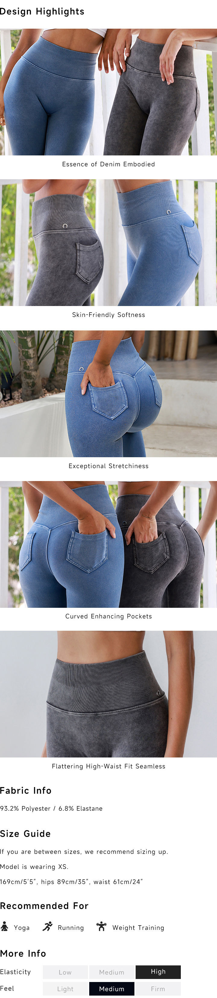 Our design embodies true denim essence with a classic wash that goes beyond typical denim styles. Crafted from a unique, skin-friendly, and ultra-soft athletic fabric, it captures denim’s beauty without stiffness. It's exceptional stretchiness suits both sports and daily wear. Featuring curved back pockets for easy storage and enhanced curves. The segmented high-waist, tightly woven design ensures a flattering, comfortable fit without any squeezing.