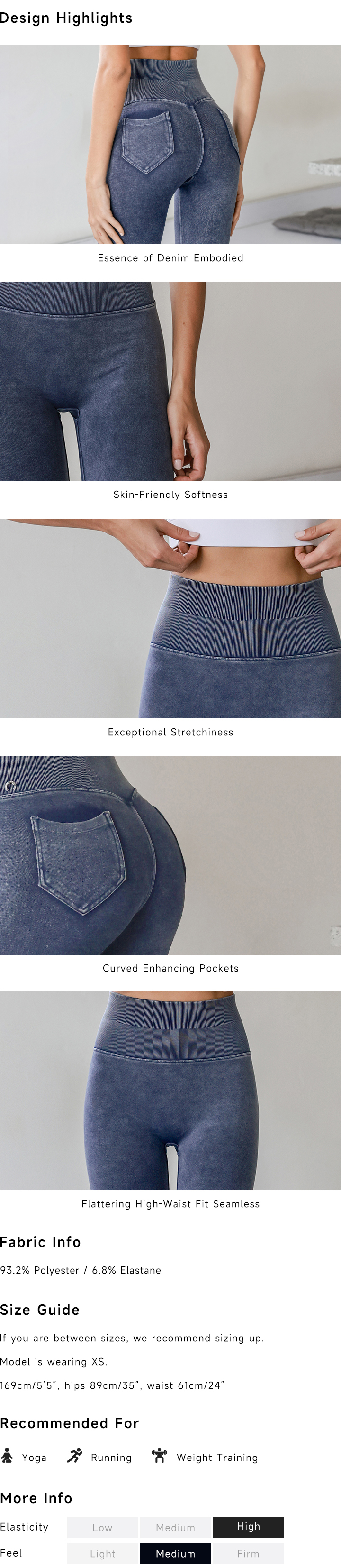 Experience the look of classic denim with the comfort of athletic wear. These leggings are made from ultra-soft, stretchy fabric that feels smooth on the skin. Designed with a high-waisted fit, curved back pockets, and body-enhancing lines, perfect for workouts or everyday wear.