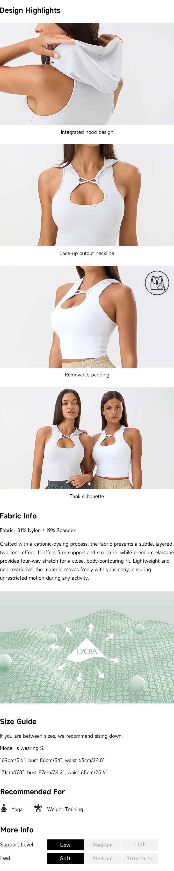 The Hood Up Sports Tank brings an unexpected edge to a clean tank silhouette with a soft hood detail and lace-up neckline. The fit feels secure yet easy, balancing structure with a relaxed sense of movement. A piece that feels just as natural on the street as it does in motion.