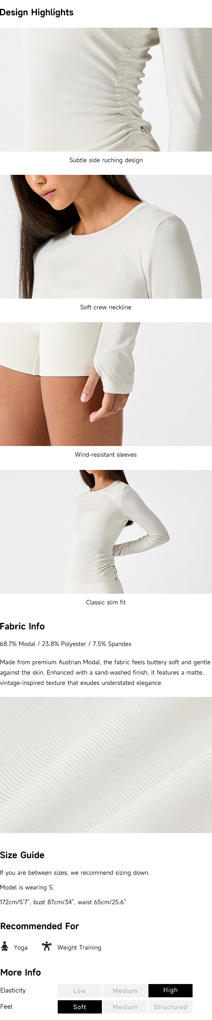 The Side Ruched Long Sleeve Top blends sporty ease with refined simplicity for a clean, contemporary look. Its smooth, form-flattering fit and gentle draping detail create a look that feels both polished and relaxed. Ideal for layering with active sets or styling solo on cooler days, it delivers effortless versatility with a subtly elevated, street-ready feel.