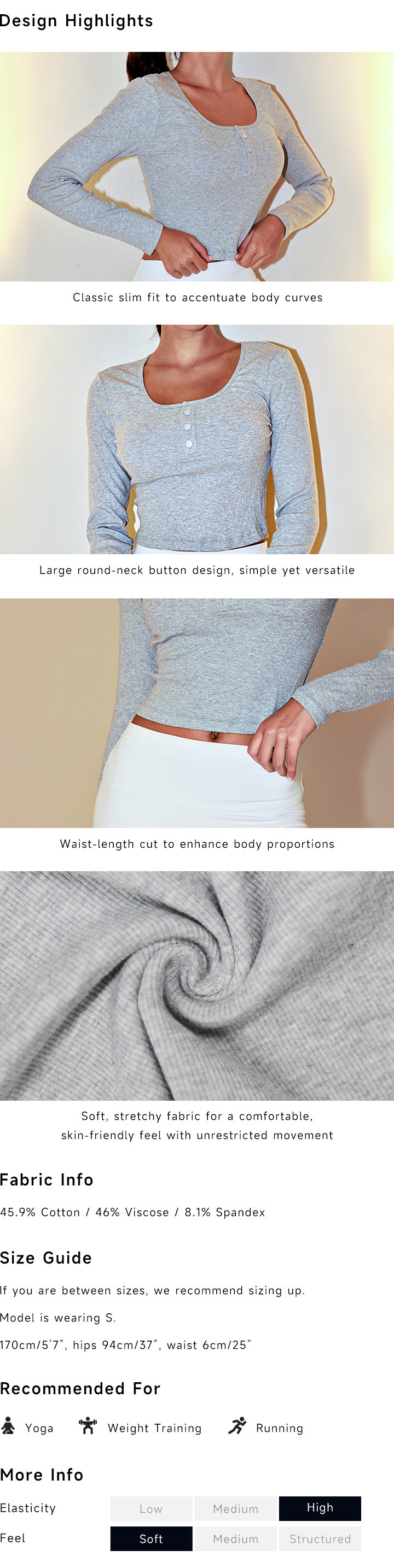 Bottom Long Sleeve Top combines a slim, curve-enhancing fit with a classic round-neck button detail. Its waist-length cut and soft, stretchy fabric ensure comfort and easy movement, making it perfect for casual wear or light workouts.