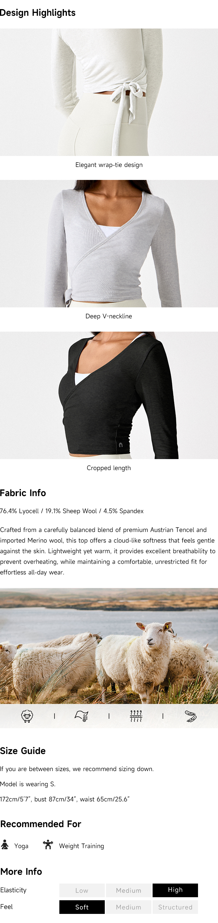 The Wrap Up Wool Long Sleeve Top blends refined softness with a modern, active sensibility. Designed for effortless layering in cooler weather, it drapes smoothly against the body with a flattering, cropped silhouette and a graceful wrap-tie accent that elevates both casual and athletic looks.